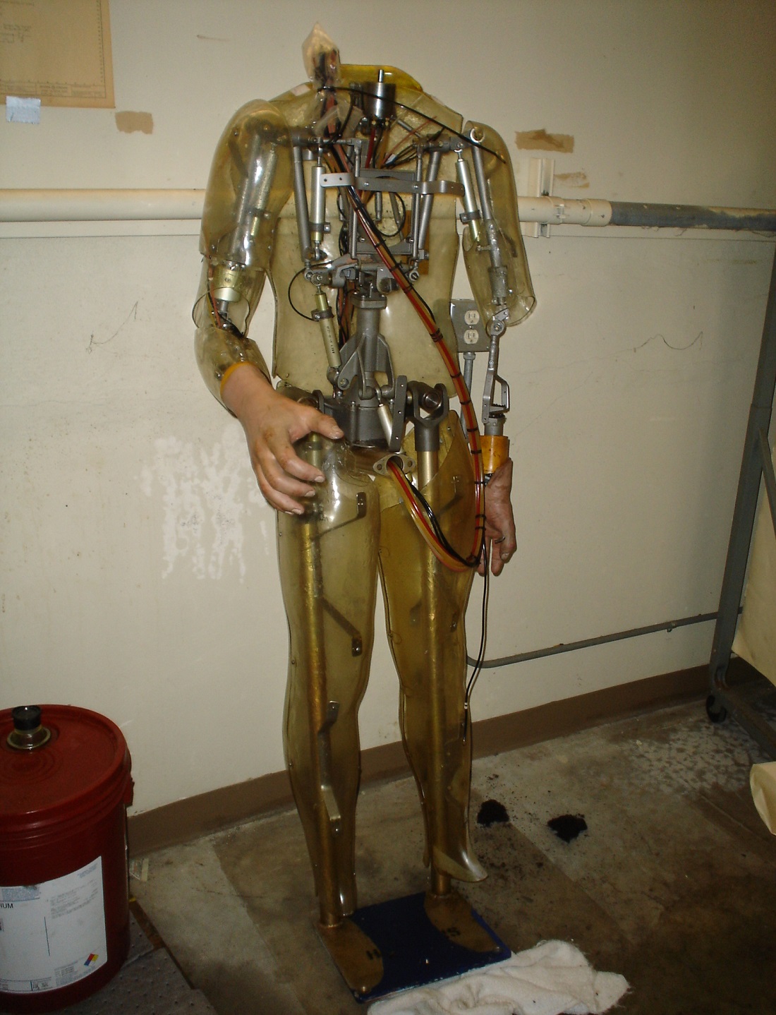 𝔁 - Mechanized innards. His limbs are full metal and hydraulics covered by transparent synthetic casing. The rest of the skeleton is mostly metal, and wires connect vital parts, but there's also a bone spine still in there, leading up towards his (organic) brain. Bone ribs protect a still-beating organic heart. Synthetic skin covers the whole ordeal, with a more realistic face-sculpt for the head and normal flesh-colored skin for the hands. The rest of his body (torso, arms, legs) is covered by a brown semi-transparent material. Real life inspiration picture here (CW: Animatronic insides)